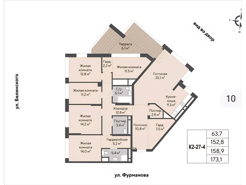 Квартира имеет функционал полноценной 5 комнатной квартиры: 5 спален от 11 до 14 м2, большая кухня-гостиная 34,4 м2, 3 санузла, 3 гардероба, постирочная, просторная терраса 6,1 м2 с видом во двор.