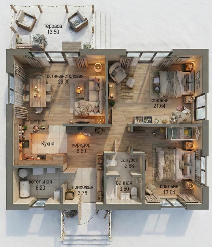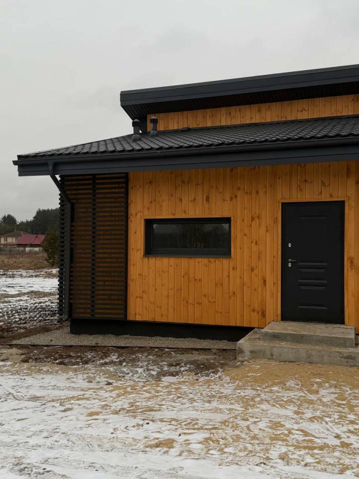 <li>В доме: просторная кухня-гостиная 29 кв.м, две спальни 12 и 21 кв. м., прихожая, крыльцо.</li>