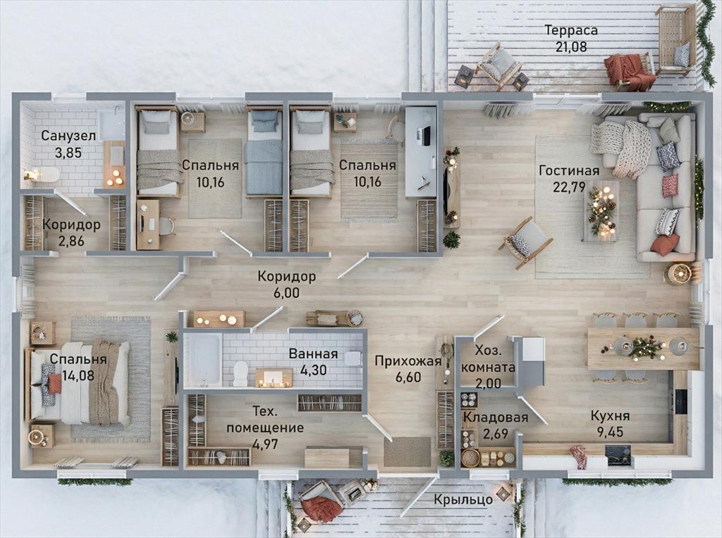 <p>Эргономичная планировка делает дом удобным для жизни. Отдельно разнесены тихая и шумная зоны. 3 спальни (одна из них -- мастер-спальня), просторная кухня-гостиная с выходом на просторную террасу, 2+ санузла и отдельные помещения для полноценной системы хранения.</p>