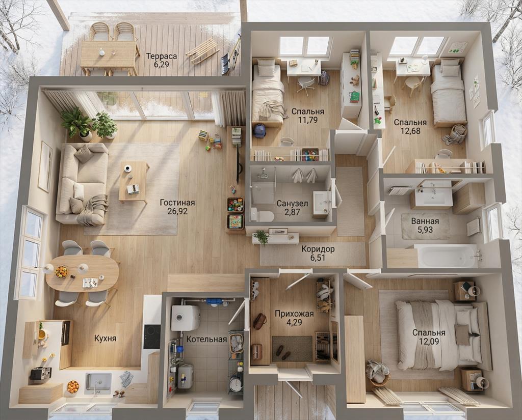 <li><b&g t;</b><b>3 отдельные комнаты</b>— просторные спальни (12,09 м², 11,79 м², 12,68 м²) они для ваших идей — гостевая, кабинет или детская.</li>