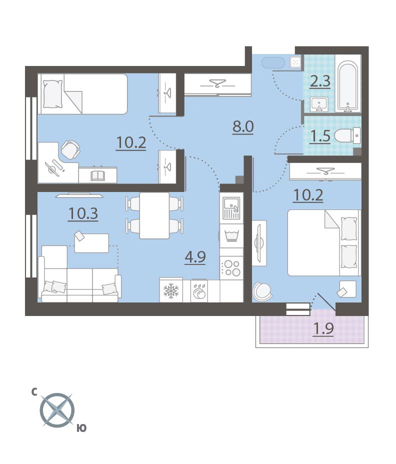 Жилая площадь 30.7 м2, кухня 4.9 м2, отделка под ключ, балконов - 1.