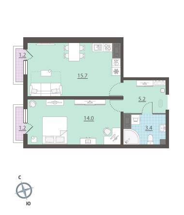 Жилая площадь 14 м2, кухня 15.7 м2, отделка под ключ.