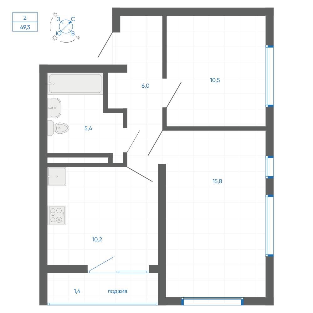 общая 49,2 м2, жилая 35,1 м2, кухни 10,2 м2 |