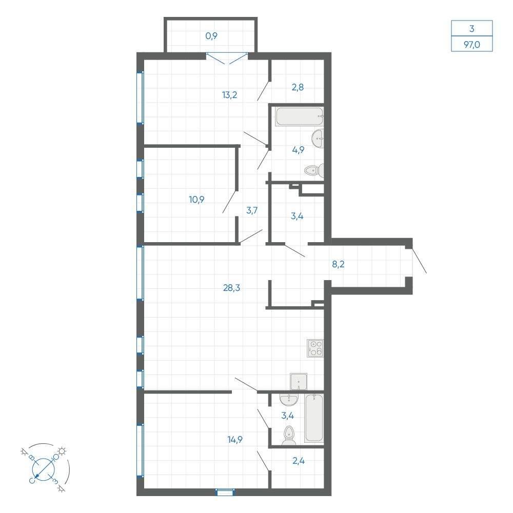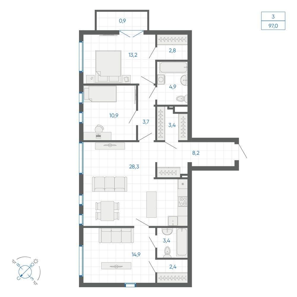 общая 97 м2, жилая 61,83 м2, кухни 28,3 м2 |