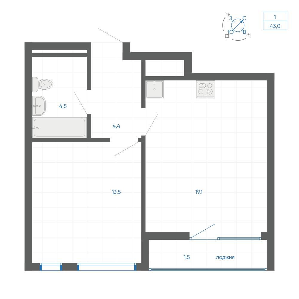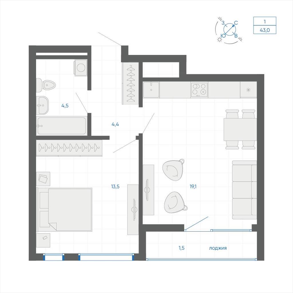 общая 43 м2, жилая 21,51 м2, кухни 19,1 м2 |