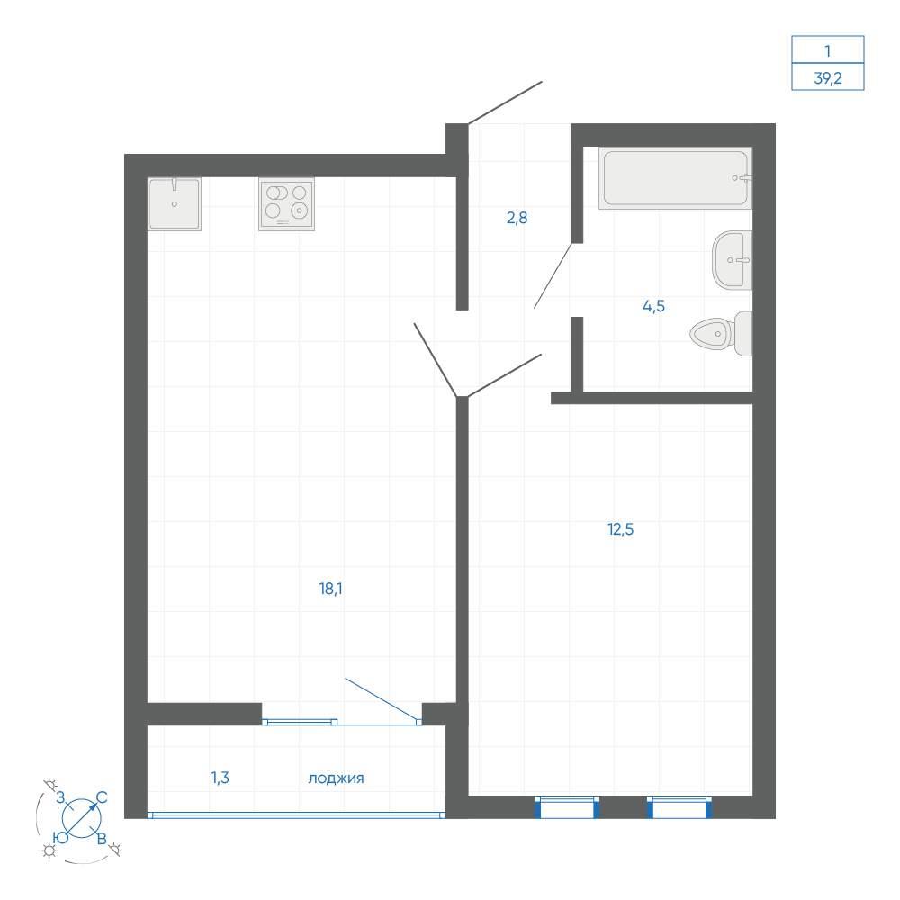 общая 38,9 м2, жилая 18,81 м2, кухни 18 м2 |