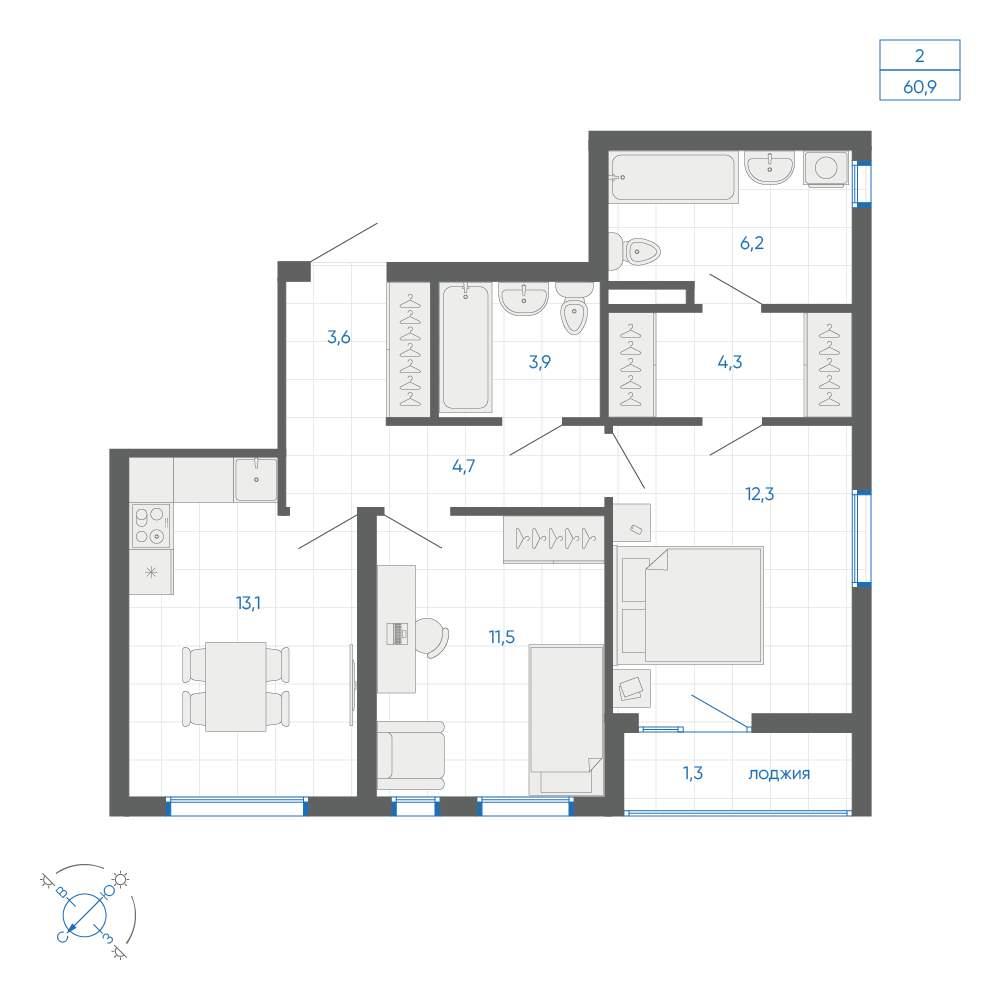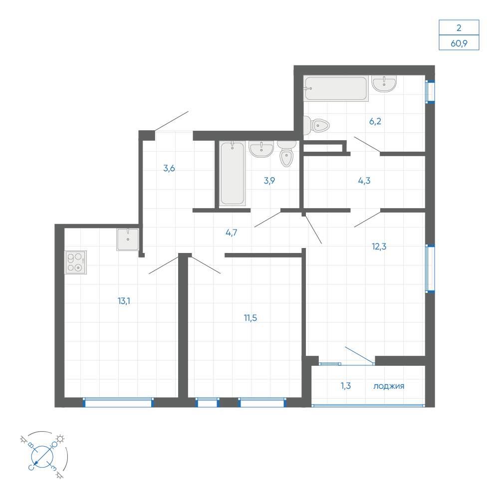 общая 60,9 м2, жилая 43,02 м2, кухни 13,1 м2 |