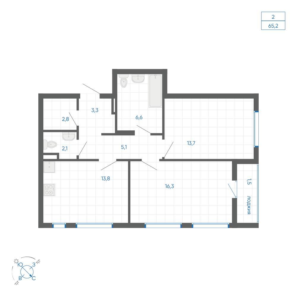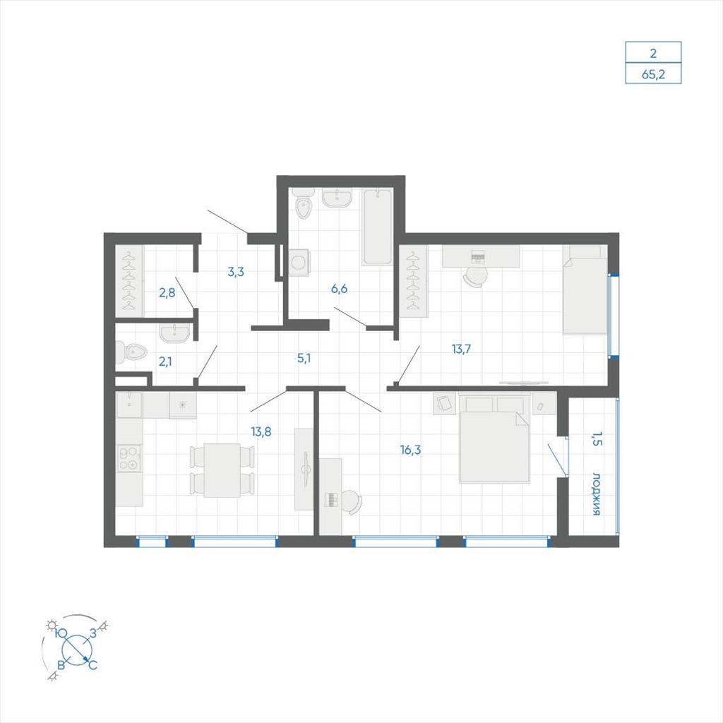 общая 65,2 м2, жилая 46,26 м2, кухни 13,8 м2 |