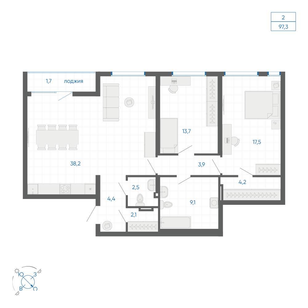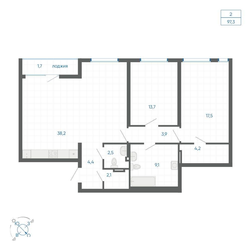 общая 97,3 м2, жилая 53,19 м2, кухни 38,2 м2 |