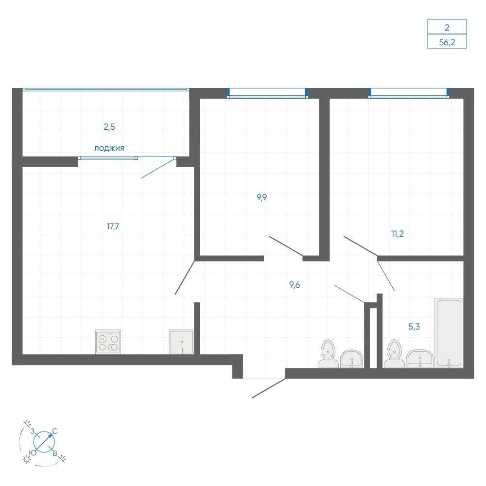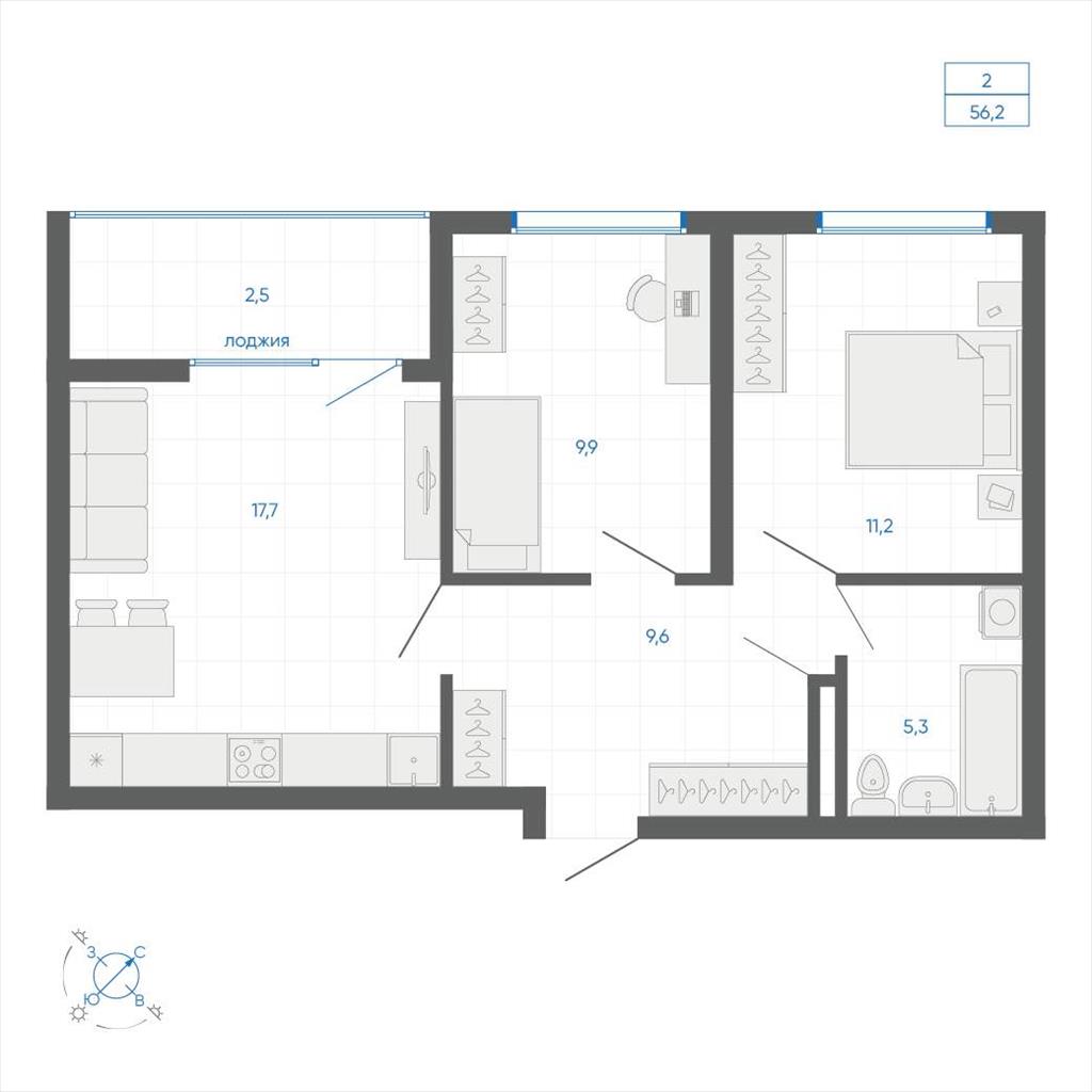 общая 56,2 м2, жилая 34,65 м2, кухни 17,7 м2 |