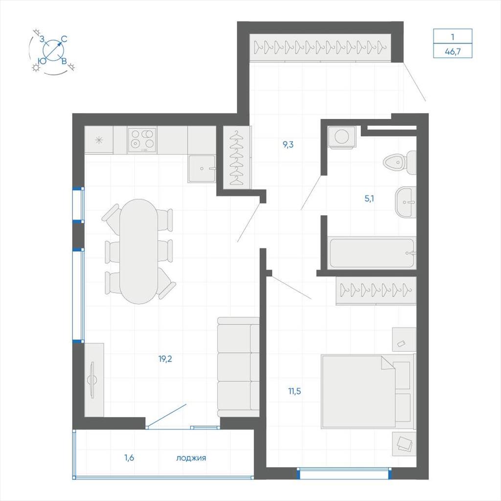 общая 46,3 м2, жилая 24,39 м2, кухни 19,2 м2 |