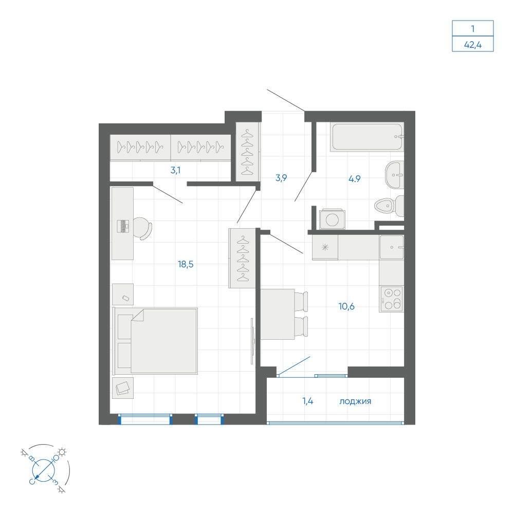 общая 42,4 м2, жилая 28,53 м2, кухни 10,7 м2 |