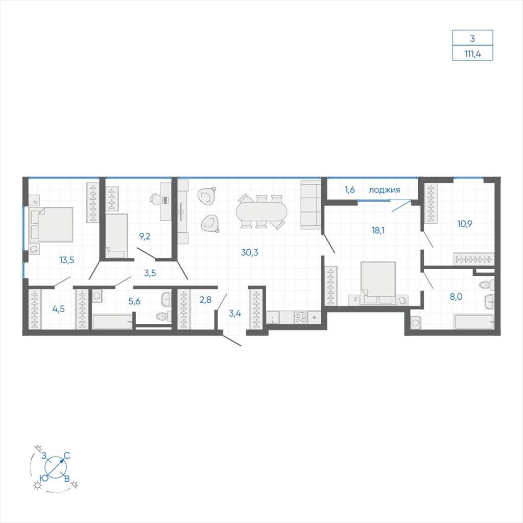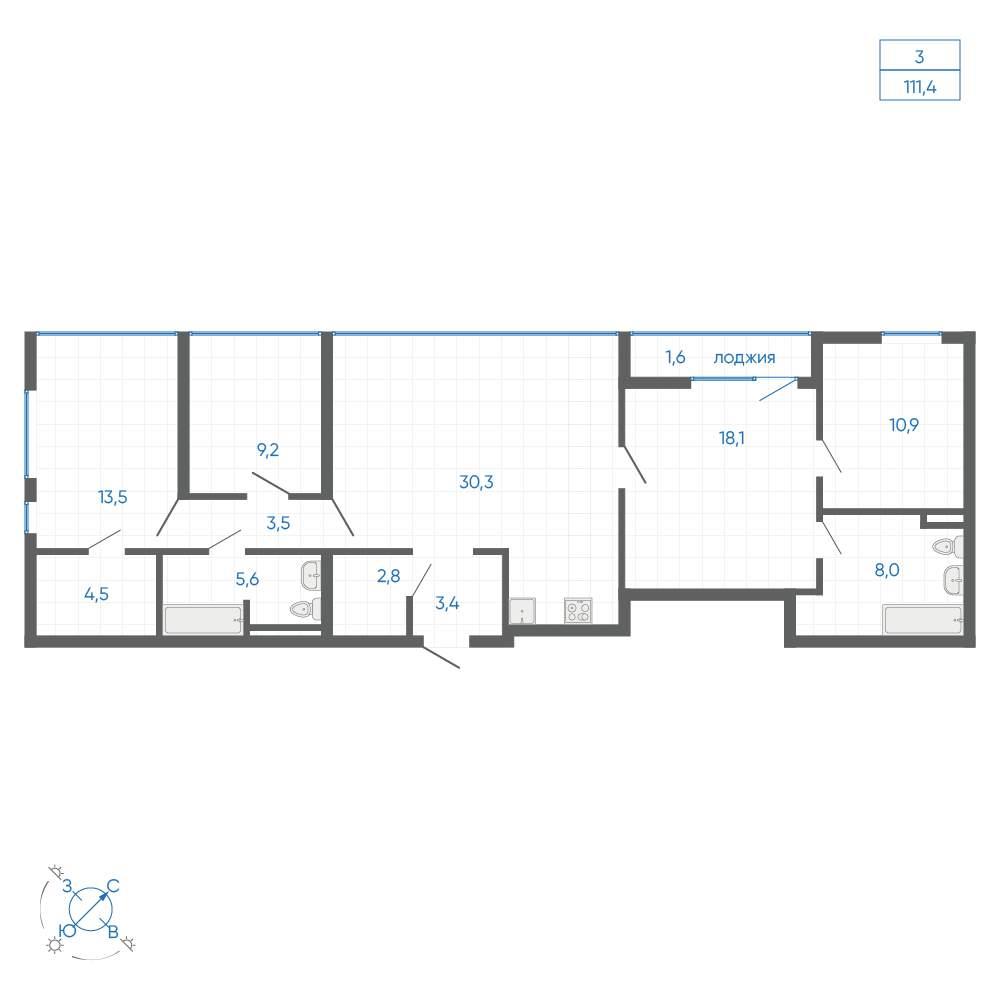 общая 111,4 м2, жилая 72,99 м2, кухни 30,3 м2 |