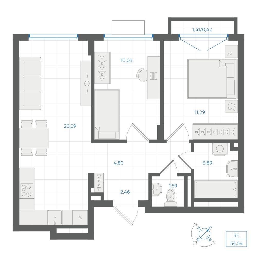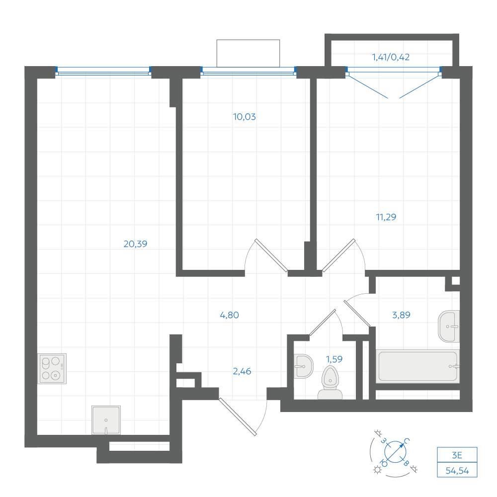 общая 54,54 м2, жилая 30,74 м2, кухни 20,39 м2 |