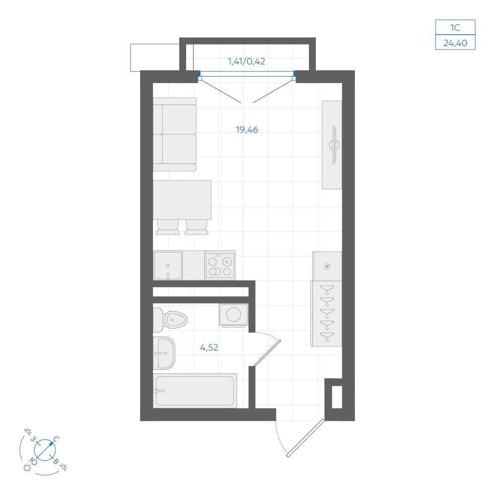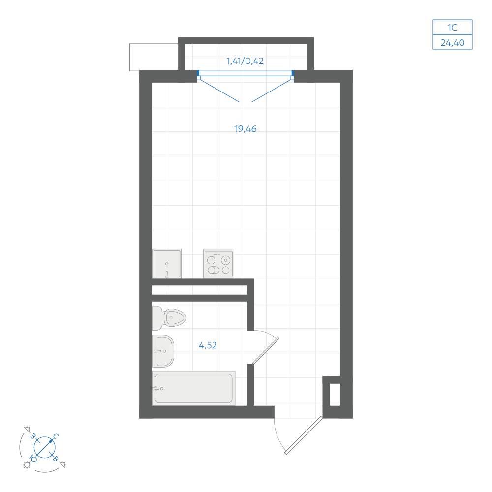общая 24,4 м2, жилая 17,45 м2, кухни 5,01 м2 |