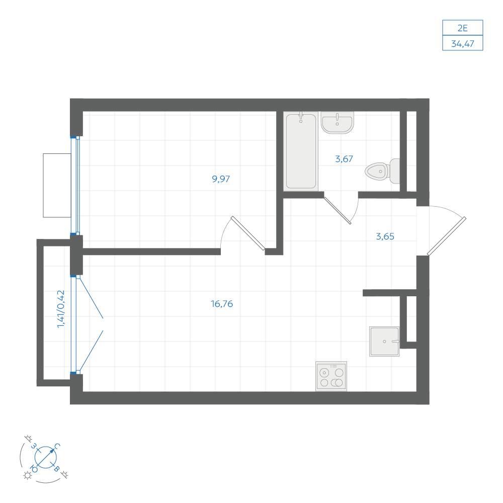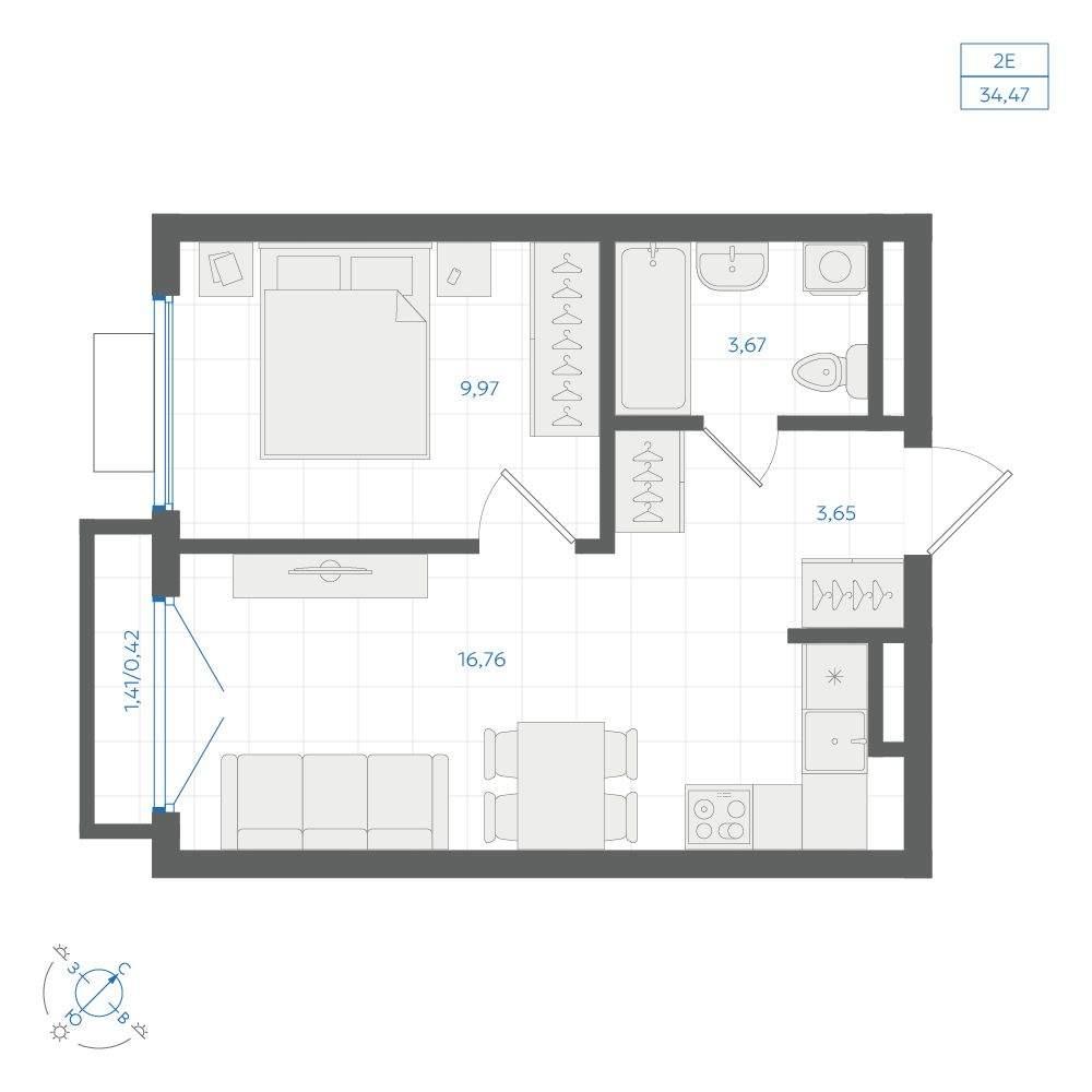 общая 34,47 м2, жилая 15,94 м2, кухни 16,76 м2 |