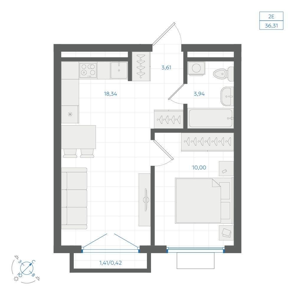 общая 36,31 м2, жилая 16,17 м2, кухни 18,34 м2 |