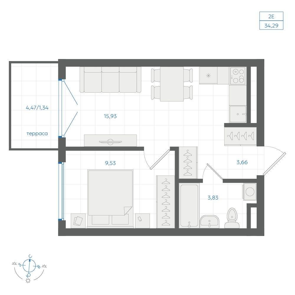 общая 34,29 м2, жилая 16,52 м2, кухни 15,93 м2 |
