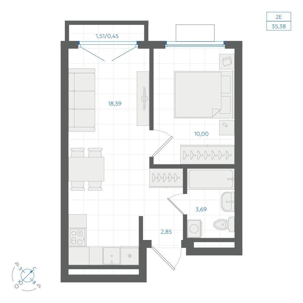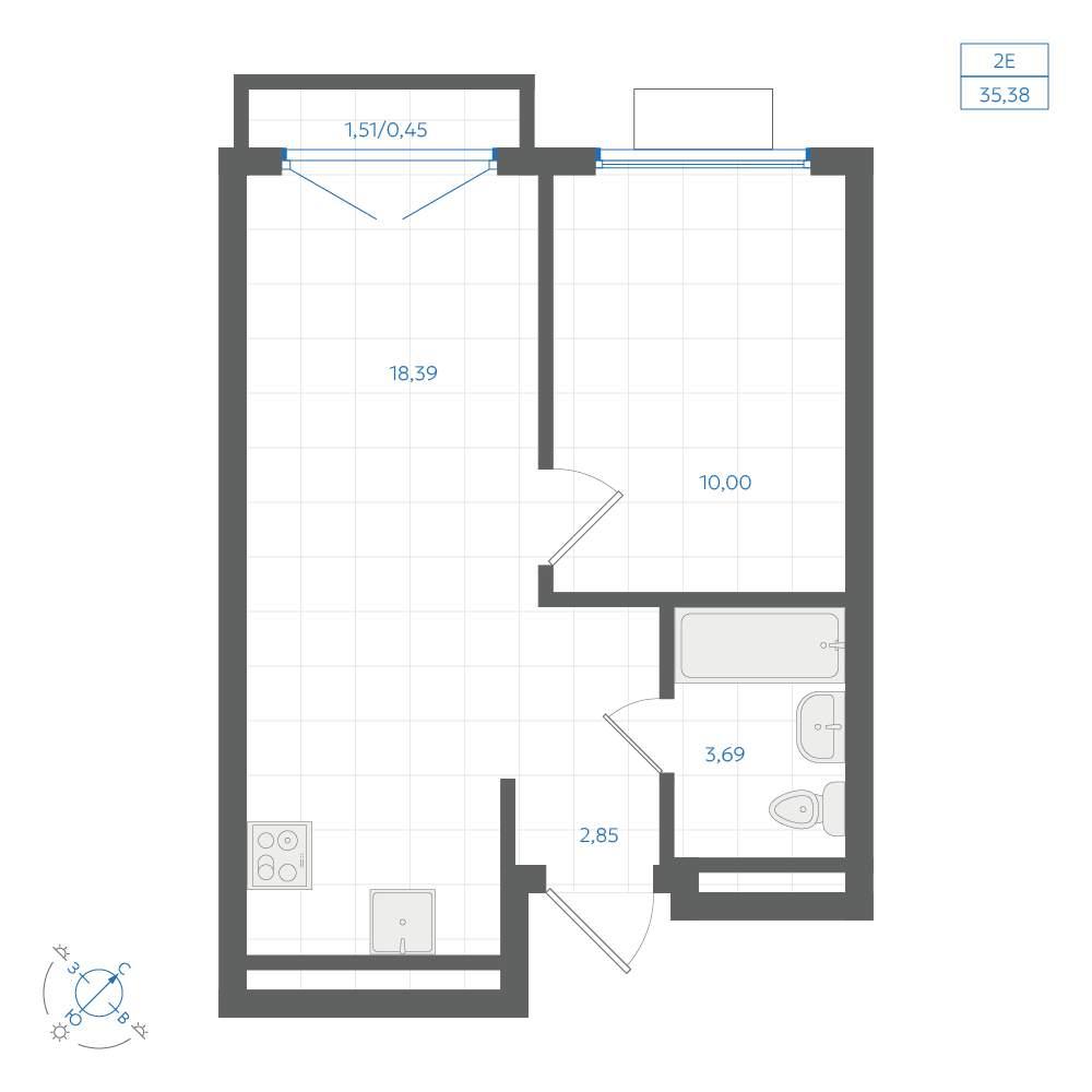 общая 35,38 м2, жилая 15,29 м2, кухни 18,39 м2 |