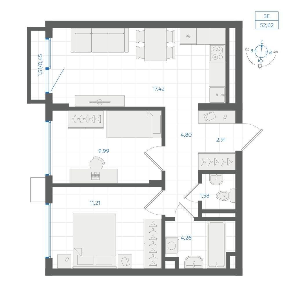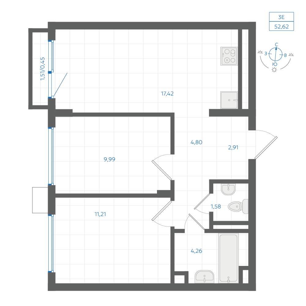 общая 52,62 м2, жилая 31,68 м2, кухни 17,42 м2 |