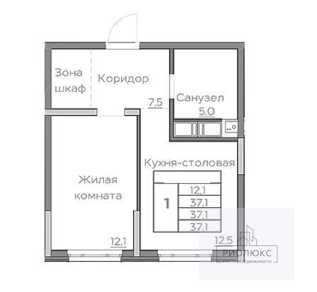 общая 32,1 м2, жилая 12,1 м2, кухни 12,5 м2 |