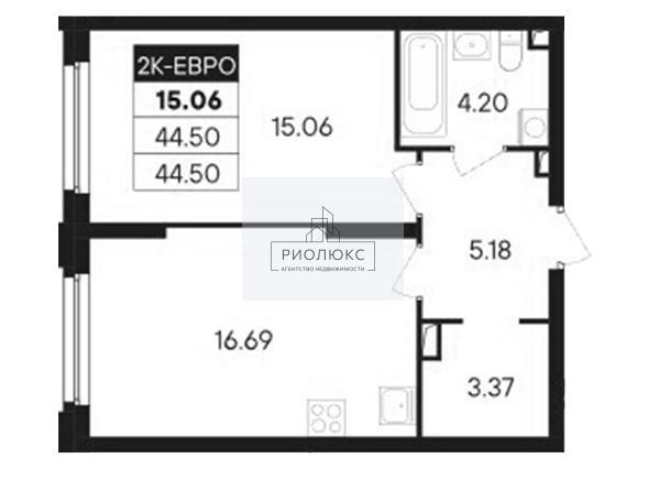 общая 44,5 м2, жилая 15,06 м2, кухни 16,69 м2 |