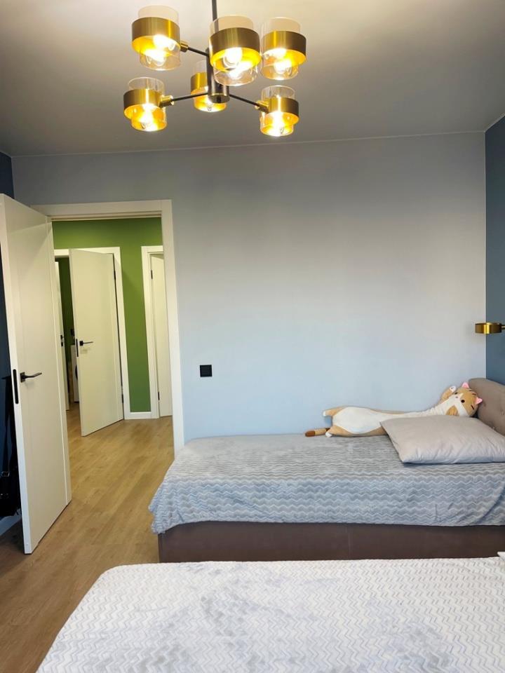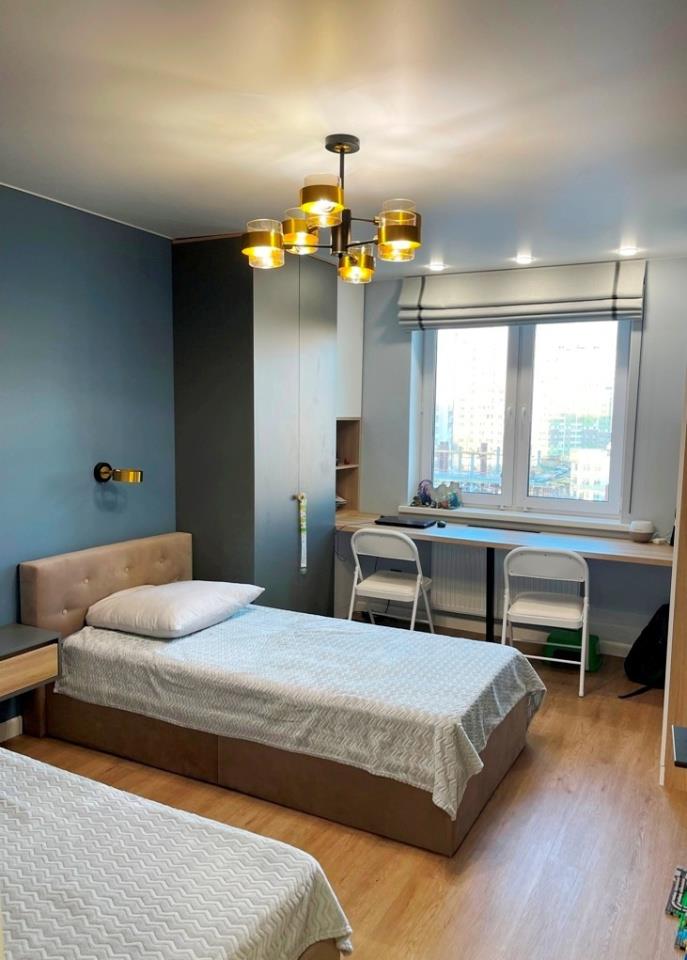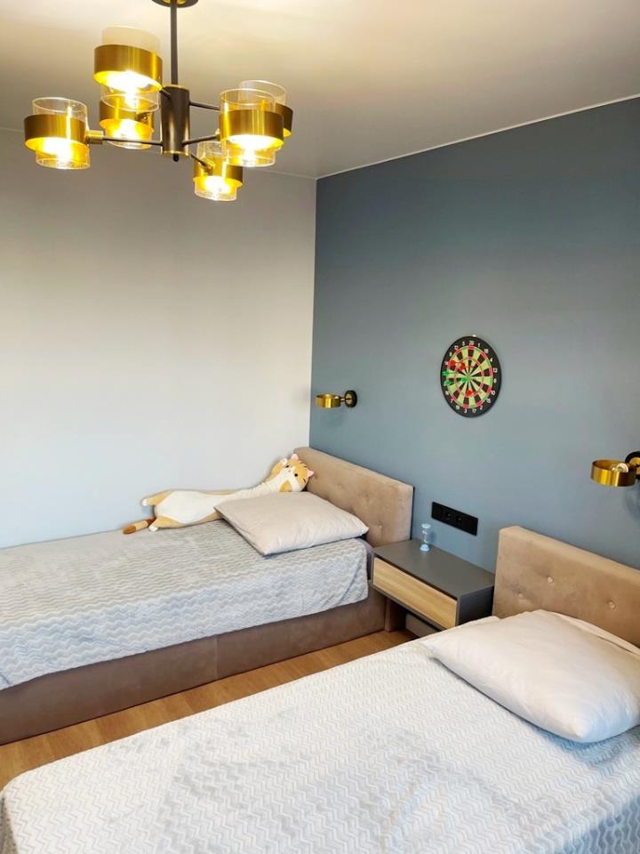 <p>Спальня - оставим кровать с матрацем, потолочные и навесные светильники; в детской так же остается вся мебель - 2 кровати, встроенные шкафы и рабочая зона – стол. В ванной останется ванная, раковина с тумбой, зеркало, смесители. В санузле – водонагреватель. Все новое !!!</p>