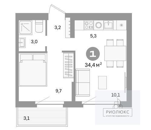 Общая площадь квартиры составляет 34,4 кв. м — это пространство, которое можно обустроить по своему вкусу. Жилая площадь — 10,1 кв. м, а просторная кухня — 9,7 кв. м — позволят с удобством разместить всё необходимое.<br />