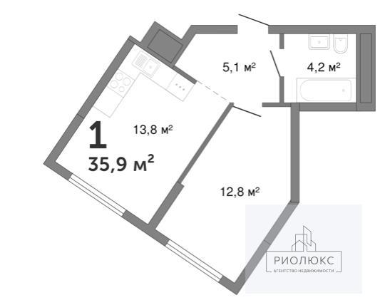 общая 35,9 м2, жилая 12,8 м2, кухни 13,8 м2 |