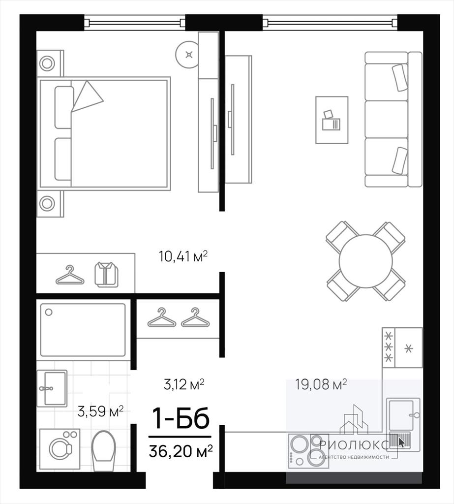 Общая площадь квартиры — 36,2 м², из которых 19,08 м² приходится на просторную кухню, где будет удобно готовить и собираться за семейными ужинами. Жилая площадь составляет 10,41 м² — здесь вы сможете обустроить уютное пространство для отдыха и работы.<br />