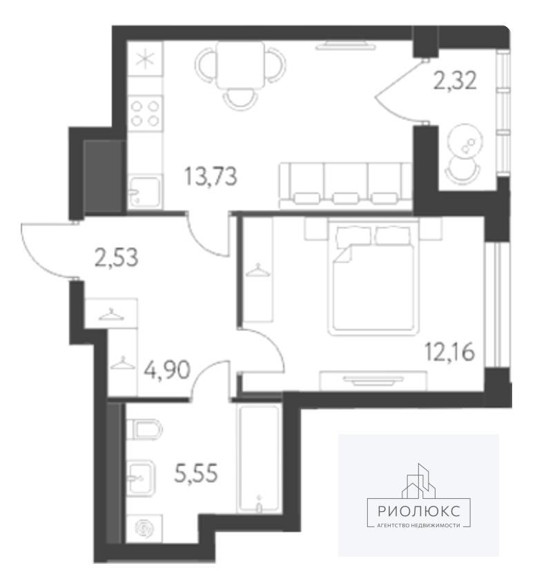 Общая площадь квартиры — 38,87 м². Здесь вас ждёт просторная кухня площадью 13,73 м² — отличное место для кулинарных экспериментов и семейных ужинов. Жилая площадь составляет 12,16 м² — уютное пространство, которое можно обустроить по своему вкусу.<br />