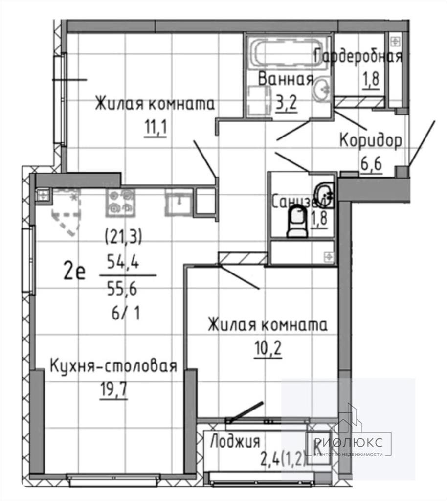 Общая площадь квартиры — 54,4 м². Здесь вас ждут две комнаты с общей жилой площадью 21,3 м² — достаточно места для комфортного размещения семьи. Особенное внимание привлекает кухня площадью 19,7 м² — здесь хватит пространства для обустройства зоны приготовления пищи и обеденной зоны.<br />