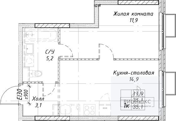 общая 35,1 м2, жилая 11,9 м2, кухни 14,9 м2 |