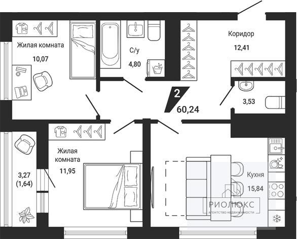 Общая площадь квартиры — <strong>58,6 м²</strong>, и каждый метр продуман до мелочей. Две комнаты с общей жилой площадью <strong>22,02 м²</strong> станут идеальным местом для отдыха и воплощения ваших дизайнерских идей. Просторная кухня площадью <strong>15,84 м² </strong>— это пространство, где захочется готовить с удовольствием и собирать за столом всю семью.<br />