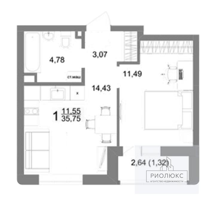 Общая площадь квартиры — 35,75 м², из которых 11,55 м² занимает функциональная кухня, а 11,49 м² — жилая комната. Здесь вы сможете создать интерьер своей мечты, воплотить самые смелые дизайнерские решения и обустроить пространство так, как давно хотели.<br />
