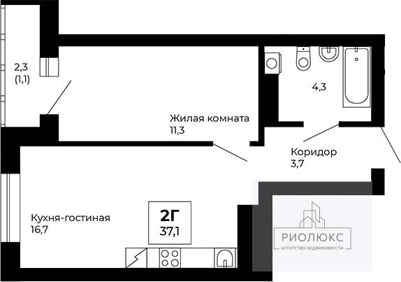 общая 37,1 м2, жилая 20,3 м2, кухни 16,7 м2 |