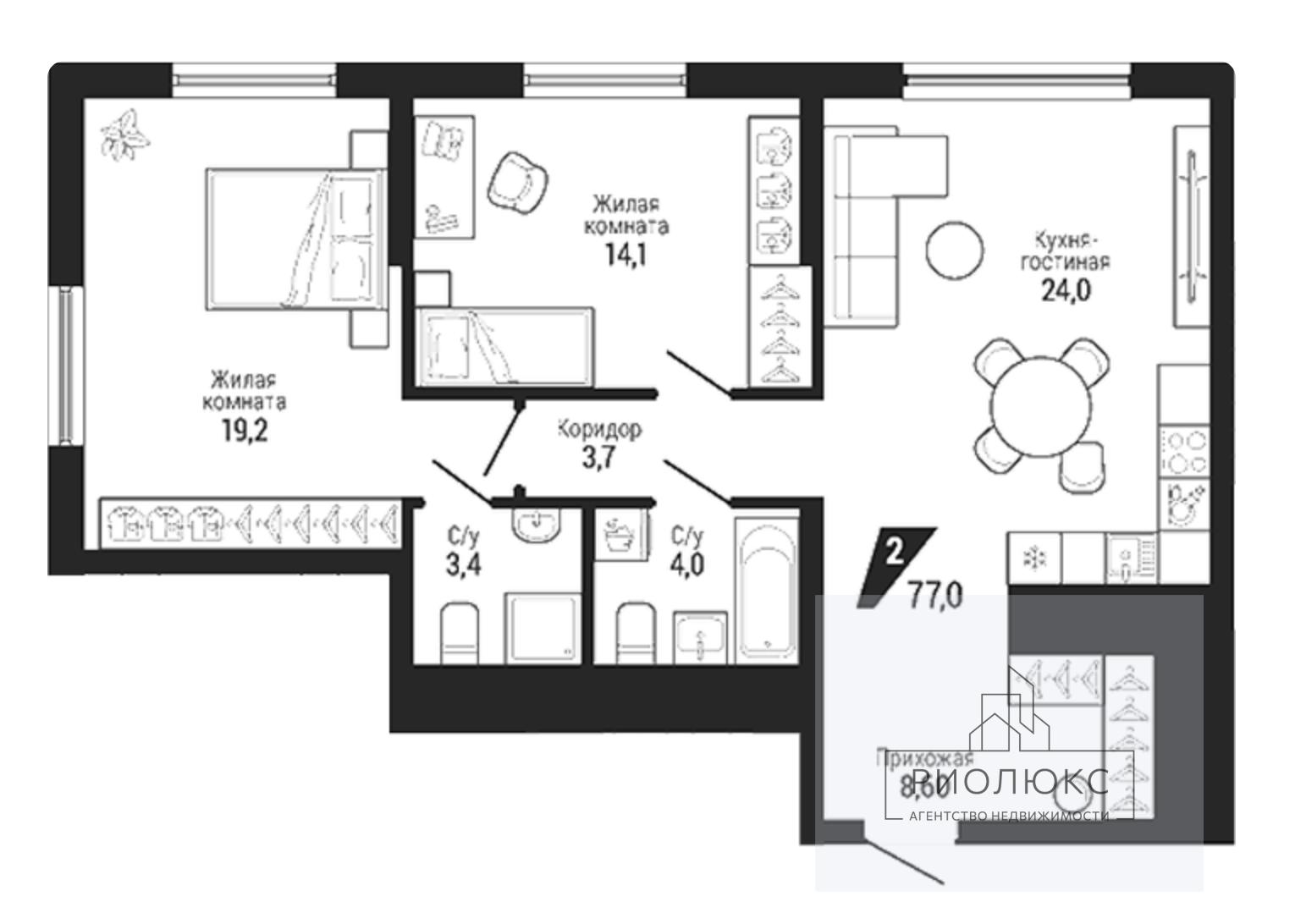 Двухкомнатная квартира 77,00 м2 по ул. проспект Космонавтов 100 за 8650000 руб. |