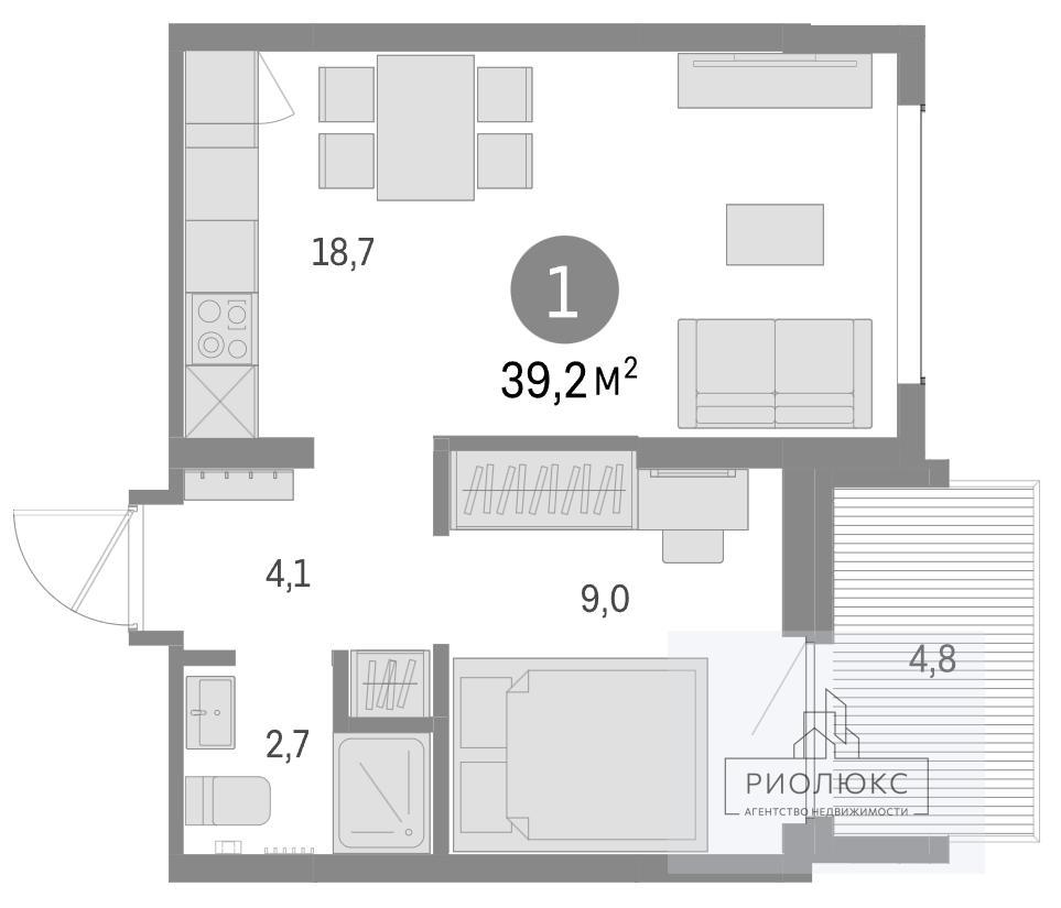 общая 39,2 м2, жилая 8,9 м2, кухни 18,7 м2 |