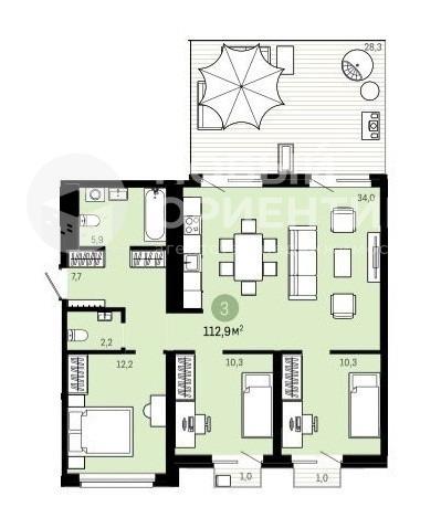 | Продаю евро 4ка с уникальной планировкой от застройщика комфорт класса Брусника. Общая площадь квартиры составляет 112,9 кв.м., которая включает в себя просторную гостиную 34 кв.м с зоной кухни, с выходом на собственную террасу 28,3 кв.м., 2 сан/узла 6 и 2,5 кв.м., гардеробная 7,7 кв.м., 2 комнаты по 10,3 кв. м. и 1 комната 12,2 кв.м. Удобная планировка позволяет разделить квартиру на детскую и родительскую зоны. Окна гостиной выходят на юго-западную сторону, что позволяет любоваться живописными закатами. Окна комнат выходят во двор на юго-восточную сторону. Дом сдан, отделка квартиры под чистовую, что позволяет сделать ремонт по индивидуальному дизайн проекту. В доме имеется паркинг, который можно купить дополнительно или арендовать. К немаленькому списку требований при выборе новой квартиры, включающему: кирпичный дом, свет, телеметрия, красивые фасады, безопасность, закрытый двор, безбарьерное пространство, кухня-гостиная, колясочная, подземный паркинг, терморегуляторы, видеодомофон, добавились: малая этажность, окна в пол, оконная фурнитура марки REHAU, персональный ключ, большой лифт OTIS, велосипедная, кладовая, двор-сад, стекла с напылением, детские замки без ключа и многое другое. Остановка общественного транспорта, автобусов, троллейбусы, трамвайная ветка к 2026 г. В пешей доступности - детские сады, школа №123, дворец дзюдо, фитнес и бассейн для взрослых Брайт Прайм, детские образовательные центры, торговый центр "Академический", "Краснолесье", в плане постройка нового торгового центра на пересечении улиц Чкалова - Сахарова, продуктовые магазины Магнит, Жизнь Март, озон. Парки для прогулок и отдыха: Преображенский и Березовая Роща, велосипедные дорожки. В районе ведется видеонаблюдение. До центра города 20 минут на автомобиле. Квартира без обременений.