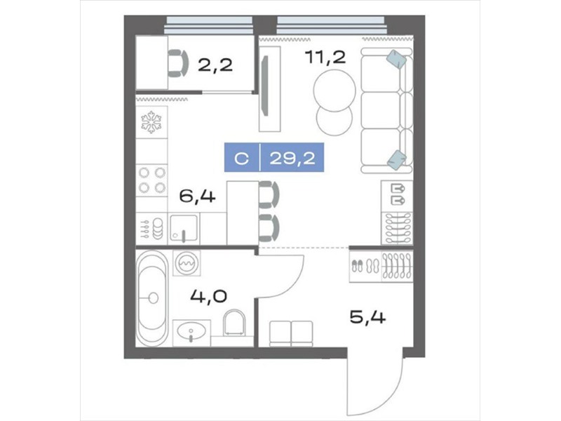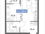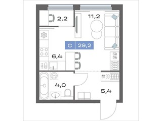 общая 29,2 м2, жилая 11,2 м2, кухни 6,4 м2 |