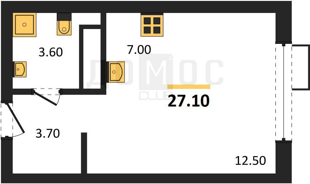 общая 27,1 м2, жилая 12,5 м2, кухни 7 м2 |