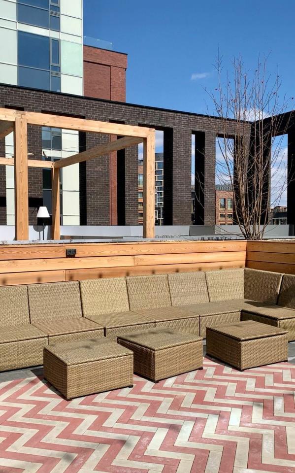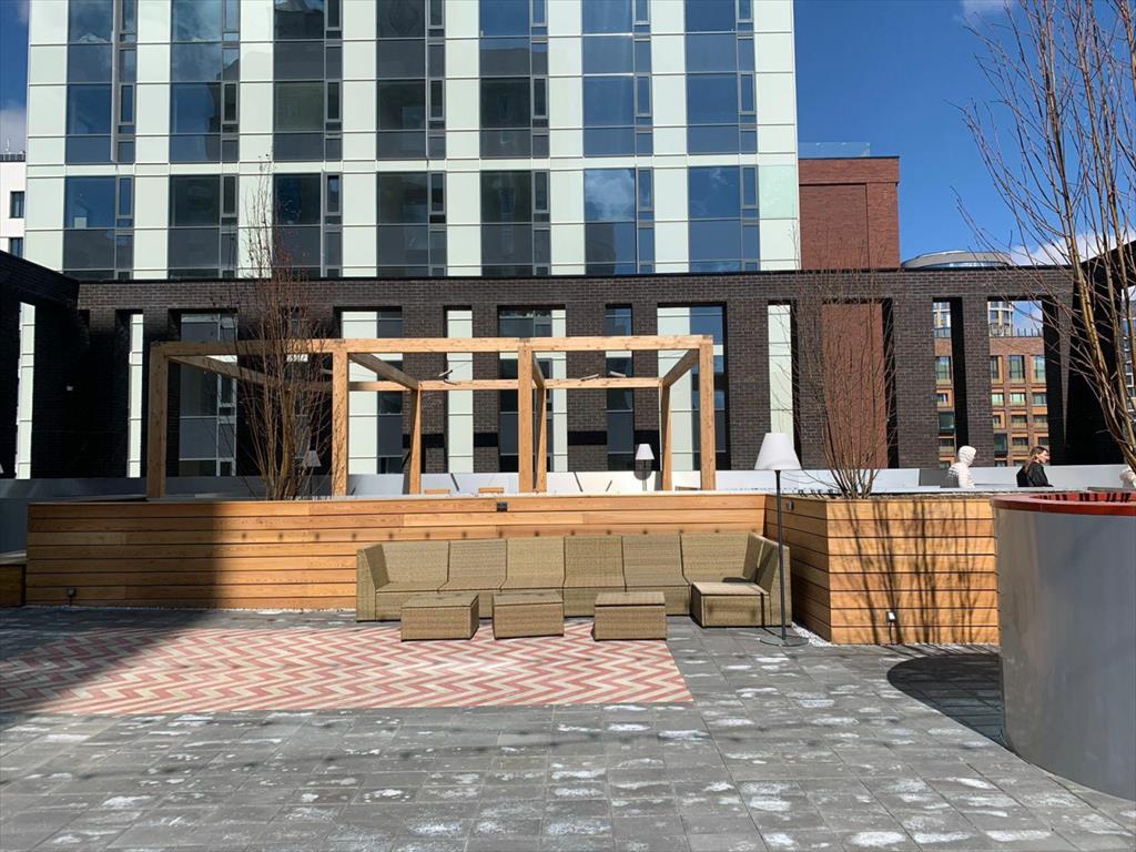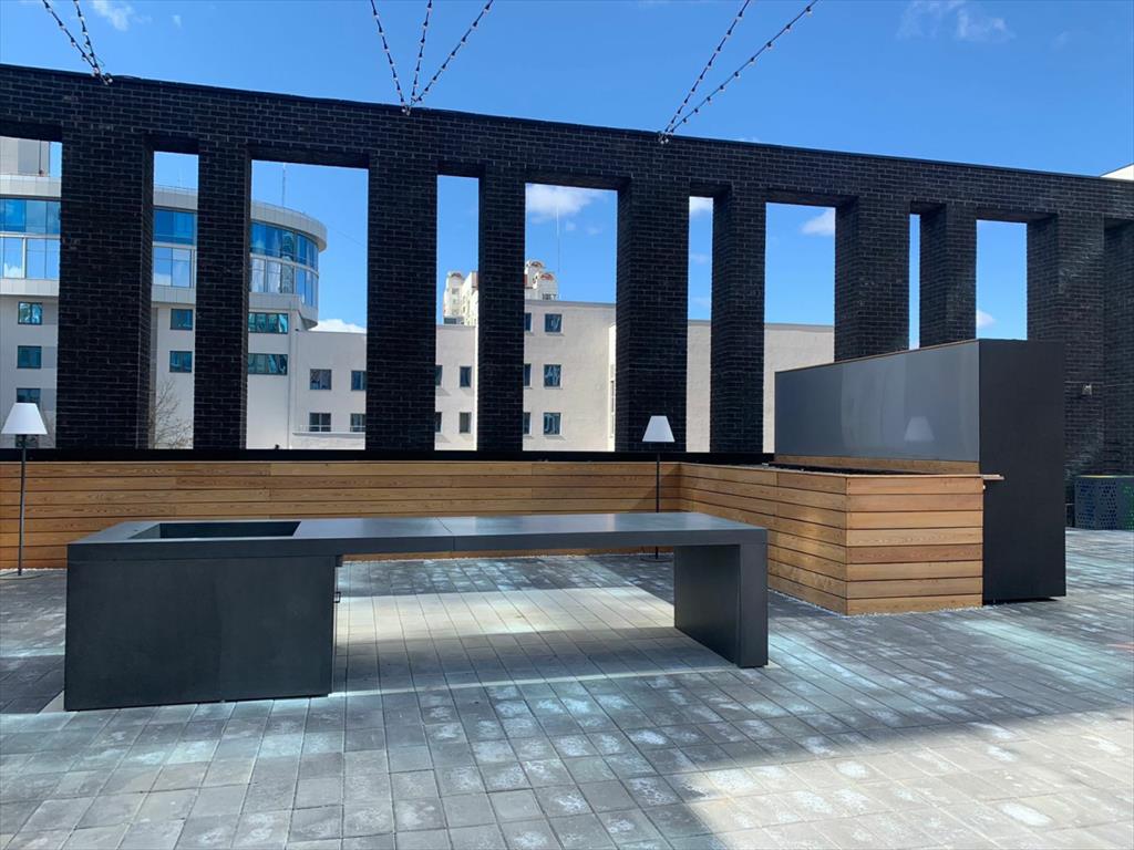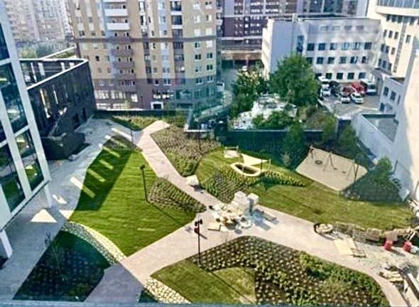 Двор - сад расположен на стилобате на уровне 3 этажа и огорожен от улицы стенами самого комплекса. Это будет укромный зелёный уголок в каменных джунглях, с эко-дизайном и продуманным зонированием.