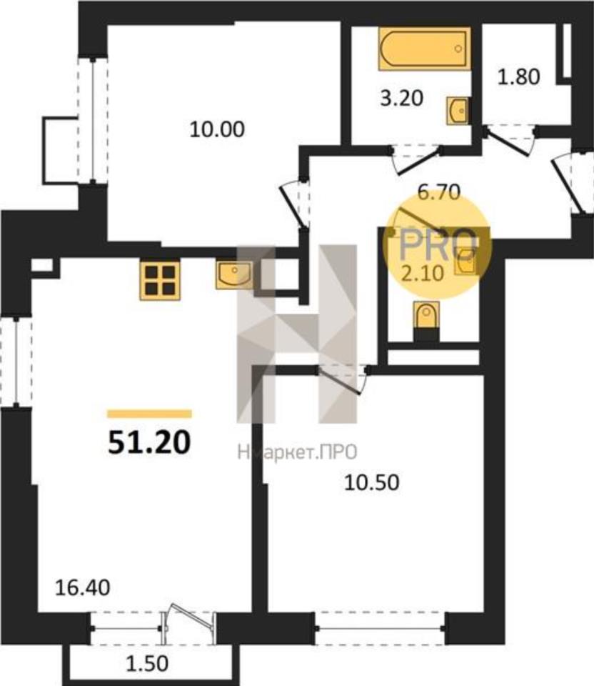 общая 51,2 м2, жилая 30 м2, кухни 16,4 м2 |