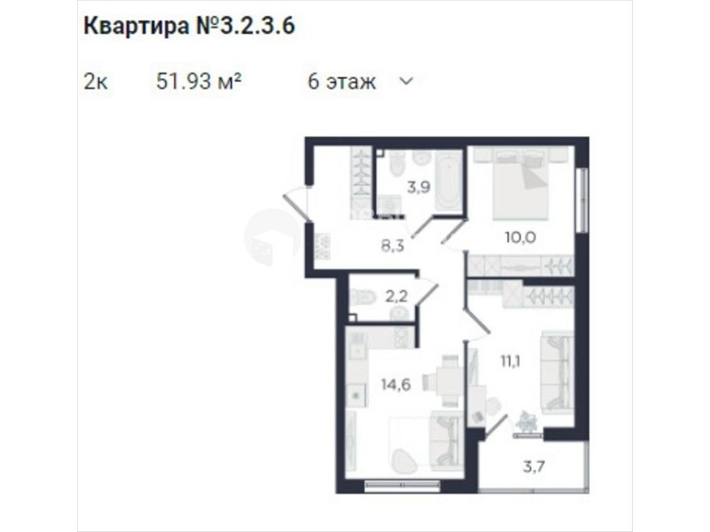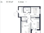 общая 51,93 м2, жилая 21,6 м2, кухни 14,6 м2 |
