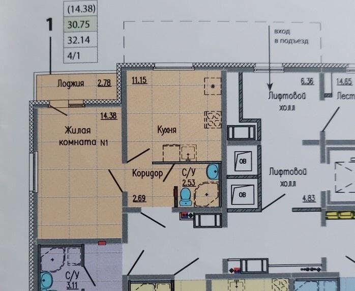 общая 30,8 м2, жилая 14,5 м2, кухни 11,2 м2 |
