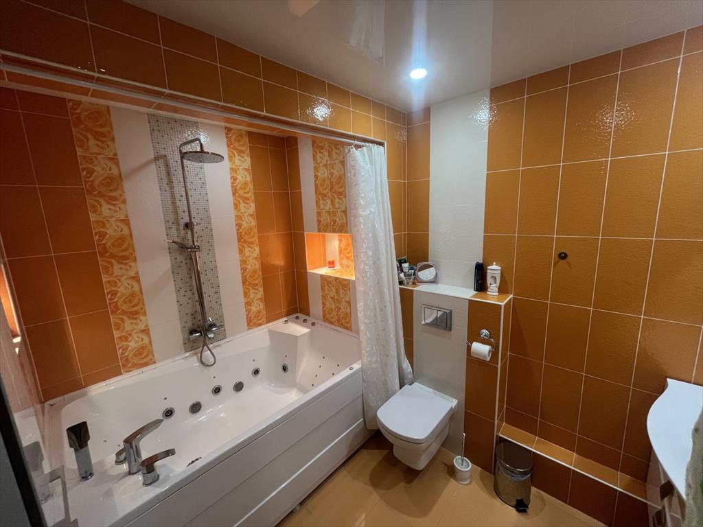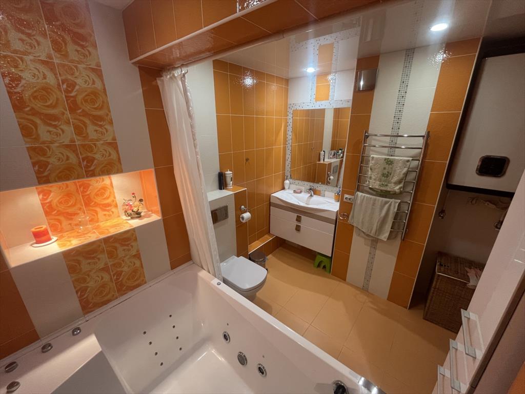 <p>В квартире выполнен качественный дизайнерский ремонт, выполнена функциональная перепланировка, в результате которой получена огромная кухня гостиная 35 метров, детская 30 метров, спальня 22.5 м., поменяна вся проводка на медную усиленную, установлена хорошая сейф дверь, заменены все радиаторы отопления, во всей квартире установлен теплый пол, качественный ламинат 33 класса, дорогие межкомнатные двери из массива дерева, сан узел отделан керамической плиткой, установлена хорошая сантехника, водонагреватель и огромная ванная с гидромассажем. В квартире три лоджии, одна из которых утеплена и может использоваться как кабинет. Большая застекленная лоджия. В прихожей организован большой тамбур, где можно оставить уличную обувь.</p>