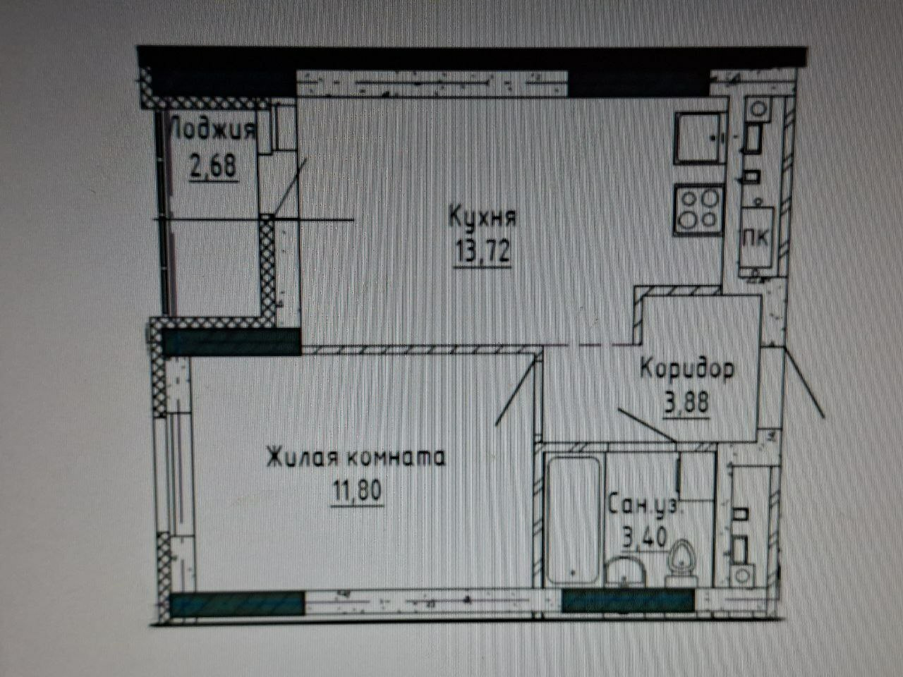 общая 34,14 м2, жилая 0 м2, кухни 13,7 м2 |