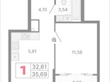 общая 35,7 м2, жилая 11,8 м2, кухни 14 м2 |