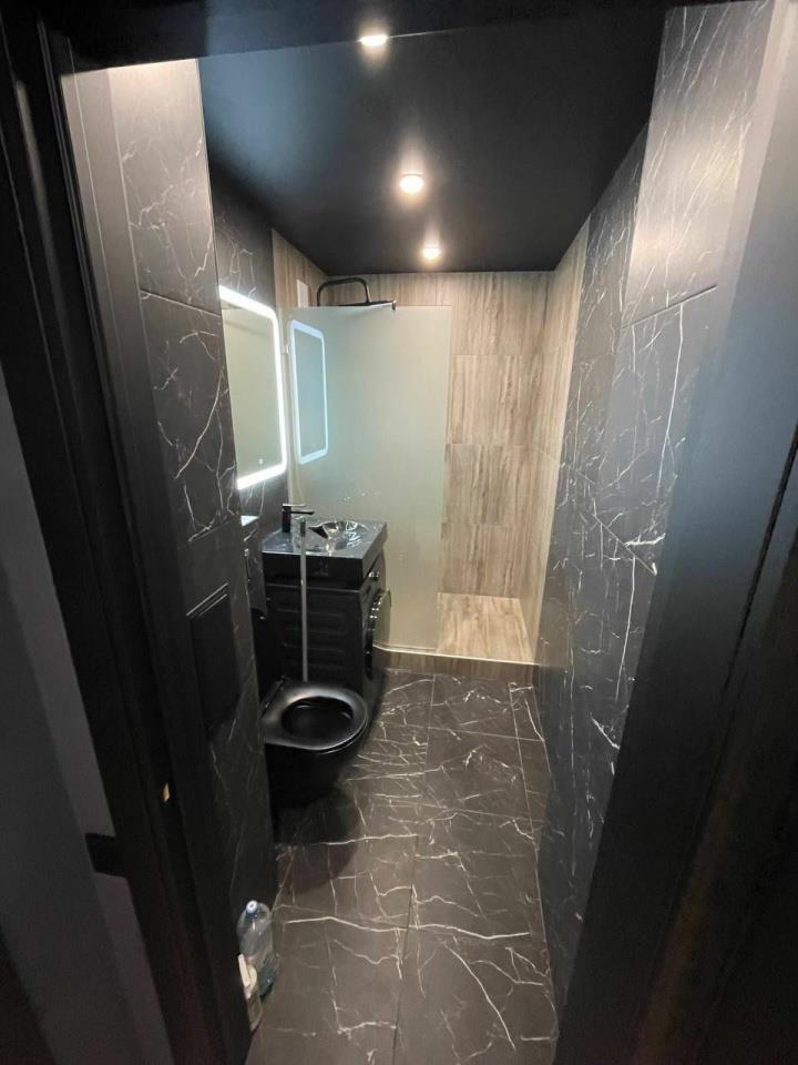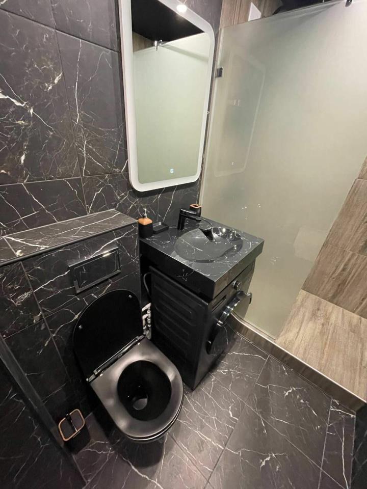 <p>Санузел выполнен в керамограните, сантехника и стиральная машина подобраны в цвет интерьера.</p>