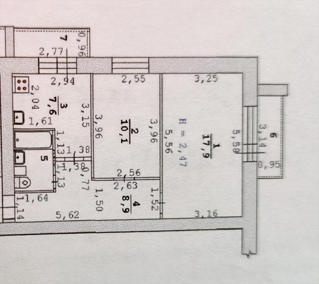 общая 47,6 м2, жилая 28 м2, кухни 7,6 м2 |